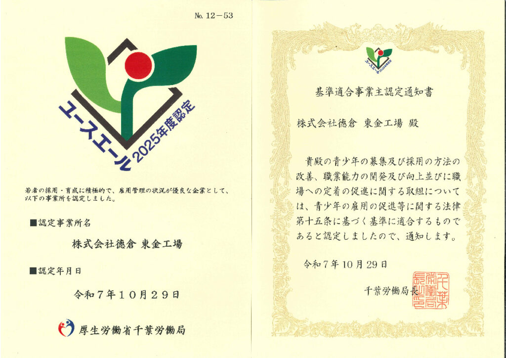 NEWS ニュース 最新情報・サイト更新情報 ホーム » お知らせ » ユースエール認定取得のお知らせ 2025.12.03 お知らせ ユースエール認定取得のお知らせ このたび、厚生労働省より 「ユースエール認定企業」として認定を受けました。 ユースエール認定は、若い世代の皆さんが安心して働ける職場づくりに 前向きに取り組む企業に与えられる制度です。 今回の認定は、私たちが大切にしてきた 「働きやすさ」と「成長できる環境づくり」への想いが ひとつ形になったものだと感じています。 これからも、社員一人ひとりが自分らしく輝き、 笑顔で長く働ける会社であり続けられるよう、 環境整備や育成の取り組みを丁寧に進めてまいります。 若い力がのびのびと活躍できる職場を目指していきます。 前へ